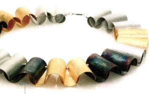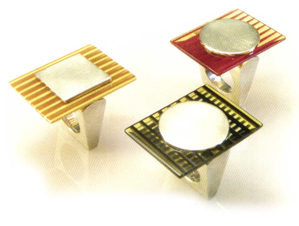 New materials and methods emerged in the 20th century in order to design jewelry in a colorful manner. Plastics, textile fibers, felt and much more led to a form of pop art revolution of jewelry during the seventies. Since then, everything that is pleasing is permitted. There were also new dying techniques such as printing, adhesive special colors for painting, targeted oxidation using chemicals or thermal influencing of the metal components and the application of foils.
