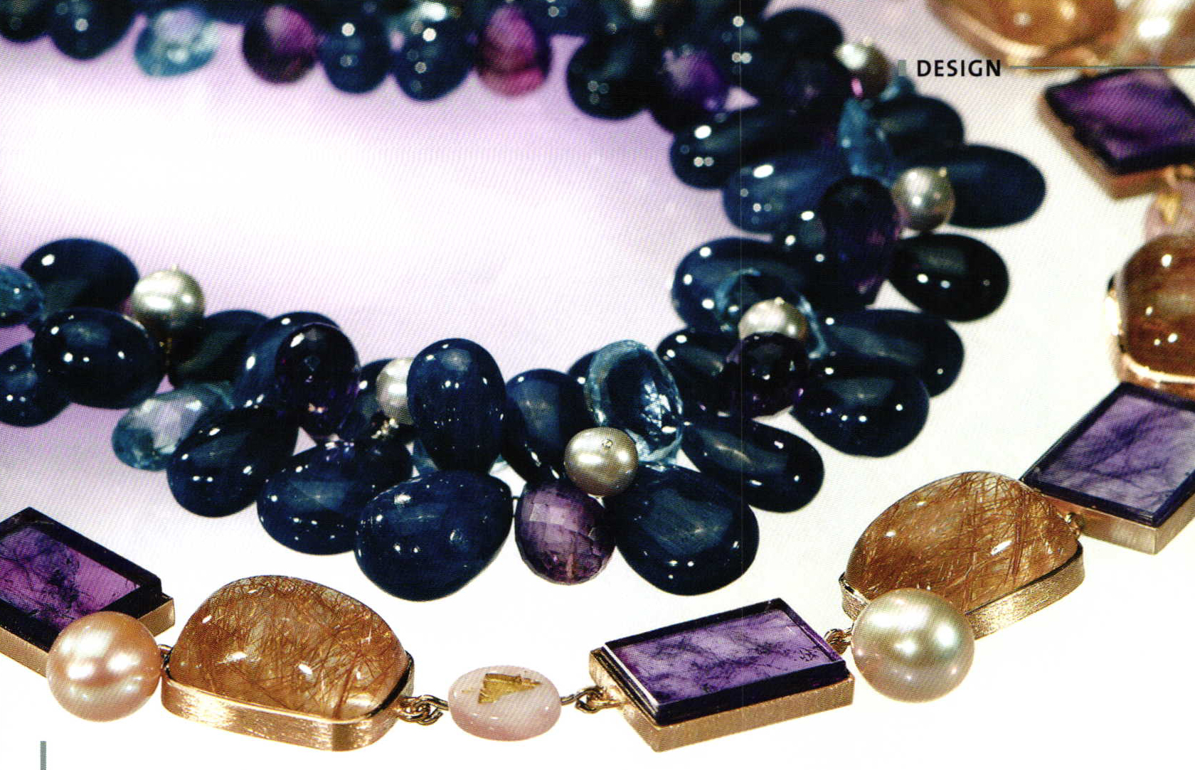 Necklaces by Ulrike Weyrich. Top: Sapphire, topaz, amethyst, freshwater pearls, 18 karat white gold. Bottom: Rutilated quartz, amethyst, pink opal, freshwater pearls, 18 karat red gold