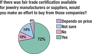 Retailers are also increasingly mindful of issues that could keep consumers out of jewelry stores. Half of survey respondents noted that at least some of their customers were concerned with the social and environmental issues surrounding gemstones, and 72 percent said they would make an effort to buy from fair trade-certified manufacturers and suppliers if such a certification were introduced. The same number said they would be interested in becoming certified themselves if a fair trade certification were offered for retail jewelers.