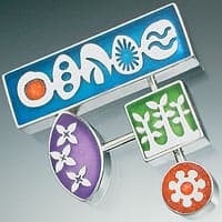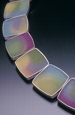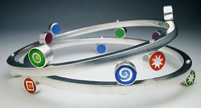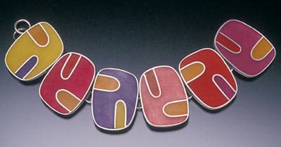 Jewelers are a restless and inquisitive group. Not content with producing sumptuous jewelry, they spray it with chemicals, dip it in acids or torch it. Just to see what happens. On a good day, what happens is colored metal. However, the unpredictability, potential toxicity, and the subdued color range of these patinas has driven a group of outsider jewelers to experiment with new ways to put color in its place: on sterling, copper, aluminum, and steel. Instead of reaching for chemicals, acid, or heat, these colorists improvise with low-tech materials and experiment with new techniques that welcome spontaneity back into jewelry making.