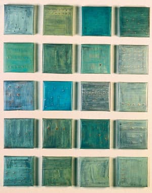 Brooke first roughs up copper sheet for better paint adhesion, then forms the edges and solders the corners and tabs to the back of her metal wall pieces. She doesn't use a primer but applies and removes paint by hand, sanding between layers. Ten layers later, Brooke wants to see the copper glowing through layers of paint. After she applies the final layer of pigment, she scratches the edges of the tiles with a rough tool and draws back into them with an engraver to reveal more copper. Once the piece achieves the time-worn look Brooke is aiming for, she seals the color with up to four layers of Renaissance Wax, buffing between layers.