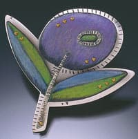 Brooke Marks Swanson is a born colorist. The daughter of artists who collected antique silk screened metal toys, colored metal was Brooke's early inspiration. It was hardly surprising that she chose to study with metalworker Billie Theide, who used unusual mediums like automotive paint to color metal. Brooke displays her own virtuosity in the wall tiles she transforms from copper to the colors of robins' eggs and Midwestern skies, using acrylic paint.