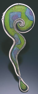 Jewelers are a restless and inquisitive group. Not content with producing sumptuous jewelry, they spray it with chemicals, dip it in acids or torch it. Just to see what happens. On a good day, what happens is colored metal. However, the unpredictability, potential toxicity, and the subdued color range of these patinas has driven a group of outsider jewelers to experiment with new ways to put color in its place: on sterling, copper, aluminum, and steel. Instead of reaching for chemicals, acid, or heat, these colorists improvise with low-tech materials and experiment with new techniques that welcome spontaneity back into jewelry making.