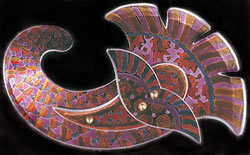 "After a while I enjoyed coloring so much that I didn't need the stones anymore, I just wanted to color the metal. That's how it started. Now all the color in my work is colored pencil. I'm not a color fanatic - my home is neutral and I wear black. I simply wanted to do something different to metal surfaces. When I began using pencil, the biggest issue was how to adhere the color to the surface. I knew other people used colored pencil on metal but I didn't really have the courage to call them to ask how they did it," laughs Karash.