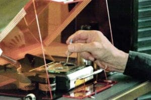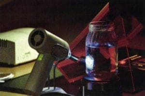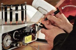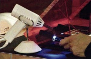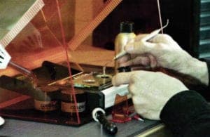 The Poretta instrument allows Colorit colors to be applied without forming bubbles. The brush vibrates as a result of an eccentric weight inside, allowing the colors to be applied to large surfaces economically and without trapping air. The colors are applied in the number of layers desired. The increments are precured with the hand-held curing light. About five minutes of curing per surface is needed to permanently cure a completely built up Colorit inlay. Rings that are inlayed all around require about 20 minutes. The light probe must be held as closely to the color surface as possible in order to make the best use of its intensity.