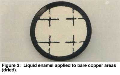 Some oxide may remain along the edges of the fired base coat. This results in a thin dark line around the fired base coat areas. Glass brush the exposed copper until shiny.