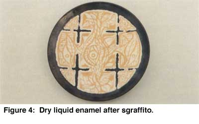 Dry the base coat until all water is completely evaporated (Fig. 3). Sgraffito your design with a sharpened wooden stick or plastic point (do not use a metal scriber as this will scratch the copper). Different thicknesses of line may be employed, but some should be sufficiently wide to expose enough bare copper to make use of the direct-for-copper transparents (Fig. 4). With a soft brush, remove any loose base coat from bare copper areas.