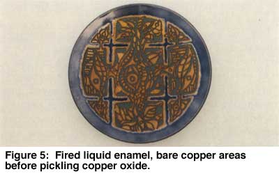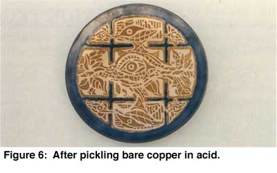 Fire at 1450?F for 1-1/2 to 2 minutes or until base coat becomes transparent (Fig. 5). When cool, pickle in acid until all copper oxide is removed from bare copper areas (Fig. 6). If desired, the piece can be left in the acid for a longer time to etch out some of the exposed copper. When covered with enamel the piece begins to take on the look of champleve.
