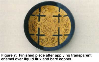 Two firings of the direct-on-copper transparent may be required to completely absorb the copper oxide. Two applications of the direct-on-copper transparent may be required for desired color intensity (Fig. 7).