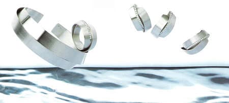 The flowing, organic forms that the jewelry designer Sabine Brandenburg Frank lends her jewelry, are symbolized by the living element of water. Top: "Fold", bracelet and rings in 18 karat gold; bottom: "Tapes", jewelry set with platinum and brilliants