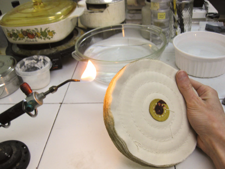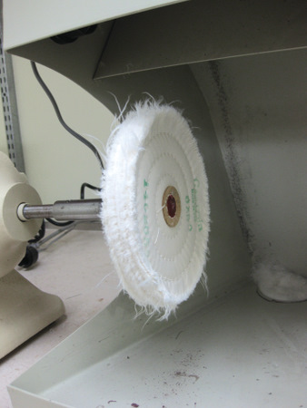 Resetting the stopwatch and turning on ventilation, I sat down at my soldering bench to prepare my second buff by singeing. I quickly passed the surface of the new buff through a small gas-only flame on my Little Torch. The loose threads burned down to the surface of the buff, and I pressed the singed surface firmly on a piece of leather to stop the smoldering. I rotated the buff and continued this process until I had singed the entire surface. Making sure that there were no remaining embers or hot spots, I put the buff on the polishing motor and quickly raked the surface to loosen any more stray fibers. I then returned to the soldering bench to repeat the process. It took three repetitions to achieve a consistent surface free of stray threads, and the entire operation took a little less than 10 minutes.I started with the raking technique. My polishing motor is rated for 3,450 rpm and has only one speed. Using an old fork and moderate pressure, I raked the buff until the worst of the shedding stopped and most loose fibers and lint were removed. This took about two minutes and left a great deal of dust and debris both on me and in the back of the dust collector. I then used a very sharp pair of scissors to trim all of the loose ends that this operation pulled out of the buff. I returned the buff to the motor and repeated the raking process one more time to remove any stray fibers. This time, there was considerably less debris, and I was left with a nice fluffy buff with a fairly consistent surface free of stray threads. The entire operation took a little less than 10 minutes.