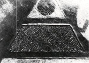In general, the harder and thicker the inlay metal, the deeper the cuts in the metal base. Cast iron, stainless steel and titanium will chip and wear the chisels down. It may be necessary to stop occasionally to sharpen the chisels on a fine whetstone. Figure 6 shows the pattern with cuts in one direction and the beginning of the second set. Safety glasses should be worn when working with cast iron due to its brittle nature.