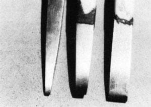 Figures 1 and 2 illustrate the chisel shapes required. It is important to retain as much of the thickness of the tool as possible. A slender tool may break. Using the belt sander, a more acute angle—30 to 40 degrees—is applied to the last ⅛ to ¼ inch from the cutting edge. Nearly all inlays may be executed using chisels of three sizes: 1/16 inch, ⅛ inch and ¼ inch. The tip of the tool is brought to an edge with a whetstone. The striking end of the tool is beveled to protect against chipping. A commercial rubberizing grip compound such as Tool Dip will cushion the shaft and increase control of the tool.