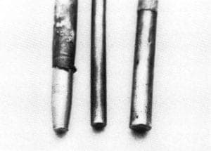 "Setting tools" are used to press the inlay metal into the textured base. Figure 3 illustrates their basic form. The setting tools are made of 3/16 to ⅜ inch tool steel or brass stock. Unlike the chisels, the setting tools are made of round stock. This eases the task of making an even surface.