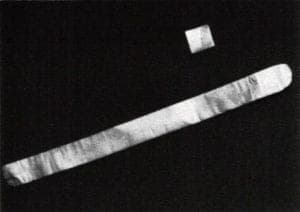 In most cases, a rolling mill must be used to reduce the inlay metal to a thin sheet. The thickness of the line silver and copper used in the example is 0.0025 inches. This material was obtained by rolling a 1-inch-square of 20-gauge fine silver into a ribbon roughly 1 inch wide by 13 inches long. During the rolling process, the metal must be annealed. Annealing the metal in a coil protects the edges of the strip from melting. Pickling the metal after ea.ch annealing will prevent oxides from being rolled into the material.