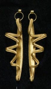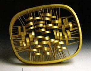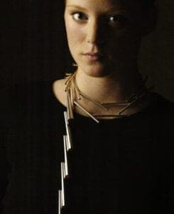 Catherine Marlin is unique with her translation of the Japanese Kumihimo technique (woven silk for formal dress and samurai attire) to goldsmith art, whereby she replaces the silk with extremely thin gold and platinum threads, producing sensational results. For Jacqueline Ryan also, who has lived in Italy for years, the crafts component is the essence of the creative process: Nature is taken as a source of inspiration and interpreted with English creativeness, Paduan technique and Mediterranean love of yellow gold. Conversely, Jane Adam draws on annealed aluminum, which enables her to design the archaic forms of her jewelry with extravagant motifs, reminiscent of her great passion for India and Indian materials.