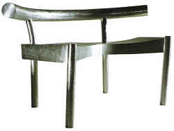 Whereas the Magakis bench is linear and ground-hugging, Scan Calyer's works are characteristically dramatic, commanding the space around them. Calyer apprenticed with both Albert Paley and George Rickey: from the former he gained his design aesthetic; from the latter be acquired technical expertise and a willingness to try the untried. He welds and grinds sheet bronze, steel, and stainless steel into volumetric structures and often combines it with drum-taut rich leather upholstery. The marriage of tone, texture, and temperature is unfailingly sensual.