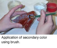Any enamel remaining on your finger should be wiped onto a 100% cotton cloth (a T-shirt is ideal, not terrycloth). Continue doing this until the color is only within the open cells. Apply this process if and where necessary on the back of the piece. This can be a little messy, but I have found that this works best because the mesh is such a thin gauge. An important thing to remember at this point is that UNDERFIRING IS THE KEY. Fire the piece for about 30 - 40 seconds. You will repeat the additional color process two or more times as needed. More colors can now be added in the same manner. Continue this application until all the cells are full.