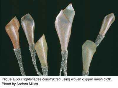In working with the copper mesh, I have found that there are endless possibilities. It can be incorporated into designs of different mediums, or it can stand alone. The meshes can be found in various gauges, weaves, opening sizes and shapes, as well as in gold, silver, stainless steel, aluminum and brass. Aside from woven wire meshes, there are perforated metals with various patterns and openings that can be used. Play and experiment with making your own mesh. Looking through knitting and weaving books, along with chainmail patterns, can assist you in this task.