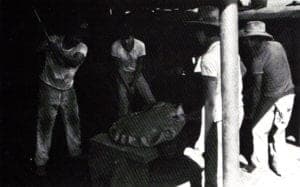 One exception to the in-shop processing of raw materials is the purchase of industrially milled copper sheer discs used in the production of trays, plates and the sinking of large cooking kettles. In making the kettles, copper discs are stacked as many as 10 at once with pitch separating the layers to prevent fusion, and these are bound together by a single, larger disc, which is folded in bezel-fashion around the edges. The entire unit is heated to cherry-red in an earthen forge and then sunk into a nearby earthen depression, again following the synchronized hammering with heavy sledges. The process is repeated until the forms are raised and then eventually separated, planished and finished with rolled edges and forged handles finally riveted to the kettle bodies.