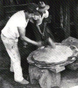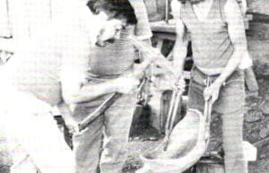 Basalt stones are used as anvils on which the hot hemispherical ingots are often cut into smaller billets, using a tongheld wedge and sledge hammer. Even though there are two trip-hammers now in the town, many of the smiths handstretch the copper hot with 14-16 pound sledge hammers. The copper is worked hot throughout the stretching and raising of the vessel and initially requires at least two men, one to hold the hot metal and the other(s) to strike the hammer blows, to accomplish each course of raising. As many as 10 men may hammer in synchronized rotation on the billet. Stakes and hammers, though functioning principally in the same manner as traditional North American metalsmiths know are specifically made and creatively adapted to suit the needs of the individual smiths. (In the case of a single smith working a form. it is interesting to note that in order to hold the hot vessel with the tongs, it is necessary to raise the vessel on a stake low enough — often mounted in the ground — that hammering is towards the body, rather than away from the smith.)