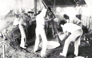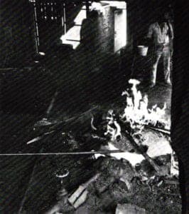 Scrap copper is inexpensive, however it requires smelting and this is performed in the individual home shops following the same technique that the pre-hispanic purépechas employed. (In that time copper was smelted as it was extracted from the earth.) Therefore, rather than using a crucible, a depression is made in the ground, (cendrada), covered with oak ashes (petacua*) and surrounded with "fire rocks" (yápicua*). In one shop, the coppersmith stated that 8 to 16 kilos of copper are smelted in this manner at a given time. The design of the typical double-tubed bellows for reducing the charcoal (turiri*) smelting fire and wood (shari*) annealing fire is also linked to the pre-hispanic past, and is derived from the use of reeds as blowers.