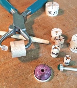 Sometimes, holding on to really little parts is the greatest challenge of my day. I use tiny cabochons almost daily for rings and stone-on-stone work, and I can't tell you how many 5 mm bezels I have mangled or lost trying to sand, polish, or prep them for a setting. To solve this problem, I created a set of interchangeable wood mandrels that fit on my beading pliers, allowing me to securely hold the bezels while I work on them.