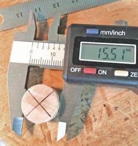 - Find the center of the dowel piece you cut by marking crosshairs. Use whatever means necessary to do so, such as calipers or a compass; I used a millimeter circle template. This is not a hyper-critical measurement, but aim to have the mark centered.