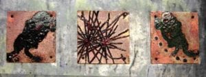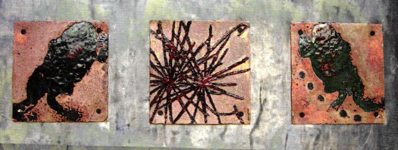 I add some of the enameled polymer etchings made by Paula van den Elshout to this article as a celebration of cooperation between two artists working in such different techniques as Paula and I do. Her works were shown in my latest studio exhibition where they were greatly admired by many of the visitors.