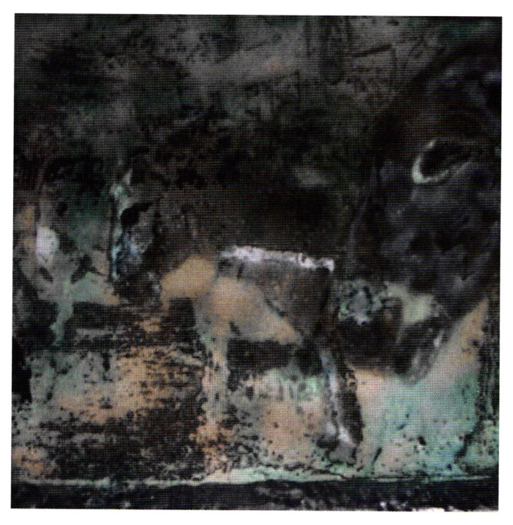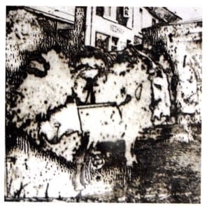 I went on etching a plate with the image of donkeys, waiting for their bosses behind a pub. Here, I added some transparent grey tones (#29I0 and #2915), sparingly, just to set the tone of the endless, patient waiting. The flux I used was #2007 (soft fusing), hence the greenish oxidation colors. Following layers of flux were #2020 and #2015, as needed in the image.