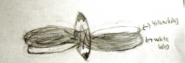 This entire project was done via telephone and email, so as you can imagine, the first few ideas were way off base. But, after a few days of sending ideas and photos back and forth, I had enough of an idea to do a basic sketch. After Kelly saw the sketch she said that it was almost what she wanted. The only change was to make the yellow gold section about half as thick as the white gold section. If you look closely at the sketch, you can see where I erased the original yellow gold line and brought it in a little. After Kelly saw the revised sketch, she said 'That's it! That's what I want." (I know I'm not the best sketch artist in the world, but if it sells the job, it's good enough)