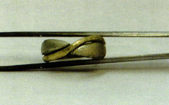 As always, the first thing I do is anneal all of the pieces to make them malleable. Next, I lightly tack one side of the yellow gold element in place and leave the other side un-soldered. Using this technique, I can gently hammer the other side to adjust the contour and fit it snugly into place. Once I'm happy with the fit, I solder it permanently into place. Next, I undo my original tack weld on the other side and repeat the process till I'm happy with the fit. Then lastly,I touch up any areas that need to be soldered for a seamless fit between the two elements. The photo shows the final mounting with the two halves joined.
