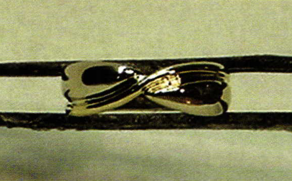 Now we have to marry the two elements back together. When I cut them apart, I took a wax pen and carefully filled in the tool marks that were created by the exacto blade. I then built up the ends of the yellow gold ribbon to compensate for the thickness of the blade.