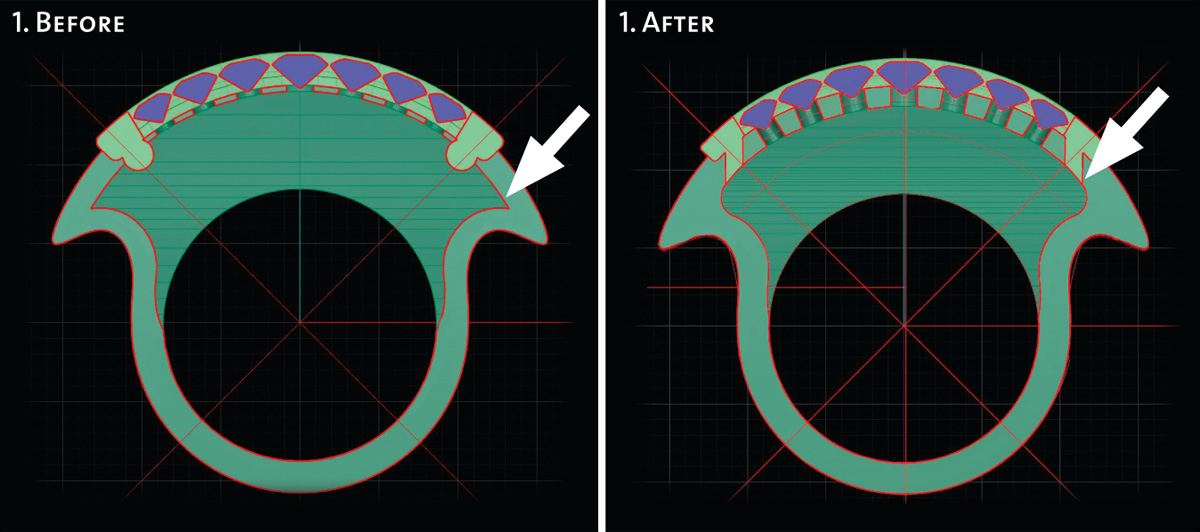 The channel-set stones in this ring, when viewed cross-sectionally, are very close together with a lot of metal covering the stones. The stones would be better farther apart to allow for natural variance in stone size and to ensure the channel is long enough for the setter. Also, the channel is too narrow for the stones to be set, as is shown by the arrows in the perpendicular cross section. Too much metal would have to be removed at setting, which is both wasteful and time-consuming.