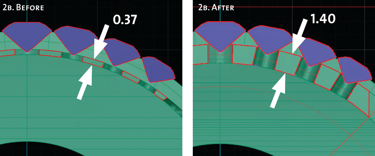 Also, other cutouts made for the assembled pieces are measurable. In this ring, the channel support is only 0.37 mm thick and needs to be thicker for structural integrity in both casting and assembly.