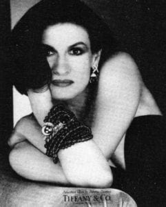 Some of the most memorable jewelry ads based on glamour are the Paloma ads. (2) As the daughter of Picasso, she symbolizes the tradition and authority of art (which will be discussed later), and, as herself, she symbolizes the glamour of the international jet-set. Sociologist Diane Barthel says that "Today, jet-setters, rock stars and fashion models have the most glamour, because they presumably have the most freedom; their lives resemble adolescent fantasies devoid of adult responsibilities. Their work, if they work, appears to be play; the world is their playground." In the author's estimation, the unimaginative jewelry designed and modeled by Paloma Picasso is successful because it is so mindless; in an odd twist, the mediocrity of her jewelry contributes to its glamour.