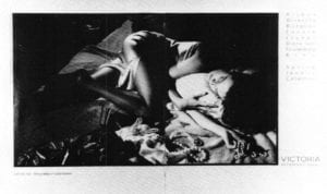 A photograph covering two pages in The New York Times Magazine. A slender woman is lying crosswise on a bed in a dimly lit room. (1) She is sleeping with one knee sharply bent, in a semifetal position. Her satiny slip is pulled up to reveal her thigh. She is hugging a pillow and holds a string of pearls loosely in one hand. Around her on the bed are seven more pieces of jewelry, a small book and a bunch of roses in a cellophane wrapper. At the bottom there is the caption, "2:48 AM, Paris. Marya asleep on a bed of pearls." This is an ad for the spring jewelry collection of Victoria International."
