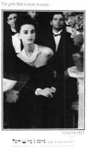 The majority of ads feature jewelry made of precious stones, mainly diamonds and pearls. Out of dozens of ads, there are many promoting gold, and few showing even silver jewelry. (Some exhibit jewelry of other materials, but these are fashion ads.) One is forced to conclude that jewelry requires the use of precious materials. Objects not made of precious materials do not fit cultural practices associated with jewelry, cannot function as social statements and do not carry within them the commonly held beliefs and easily understood symbolism of jewelry.