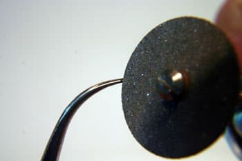 Use a sharpened separating disc to cut a groove across the tips of the tweezers about 0.5 to 0.25 mm from the ends.