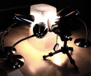 This is a picture of the Light Box in use, using 4 of 5 lights. The telescoping down light is not pictured. Amini tripod holds a digital camera.