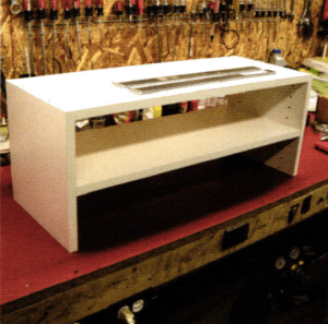 If your bench has a rim around the edge, notch the back of the shelf to match the rim. In this case it was 1/2 of an inch deep and 1 1/2 inches high. If your bench is against the wall this makes it harder for stuff to fall behind the bench.