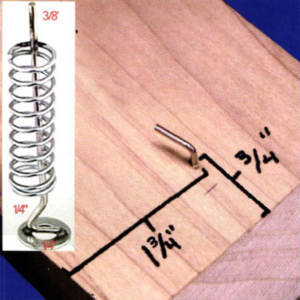 To make the ring holder, begin by drilling a 1 1/6 inch hole as pictured.Then straighten out a heavy-duty paperclip so you have a straight piece that is 2 3/8 inches long. From one end mark off 1/4 inch and 1/2 inch and from the other end mark off 3/8 inch. Bend the bottom to match the drawing and solder it to a 3/8 inch washer. Drop a spring over the top and push it up through the hole in the wooden base. Push up from the bottom compressing the spring until the 3/8 inch mark on the wire shows then bend with pliers to a 90 degree angle.