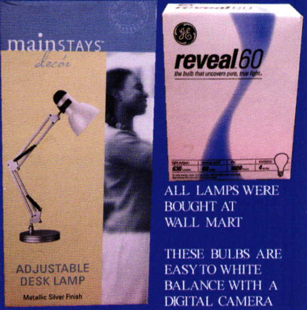 GE's Reveal light bulbs do a good job imitating daylight. You'll need four 60 watt bulbs and one 40 watt bulb. The other lamp pictured here is an extension type for shooting down from the top using a 40 watt bulb.