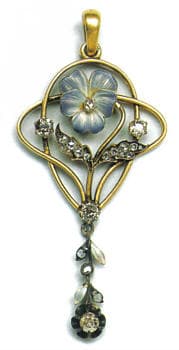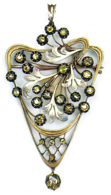 | Pendant. Moscow, 1899-1908. Gold, diamonds and enamel | Necklace. Moscow, start of the 20th century. Gold, demantoide and opalescent enamel |