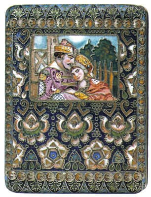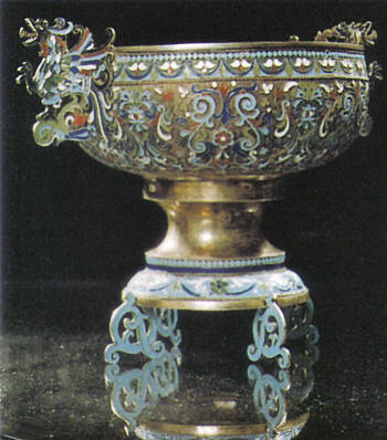 | Dish. Moscow, around 1890. 1. Katorski's Studio. Goldplated silver, enamel on filigree and carvings. |
