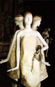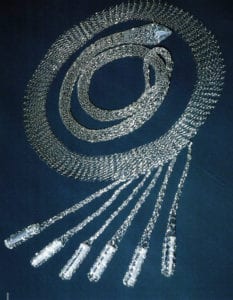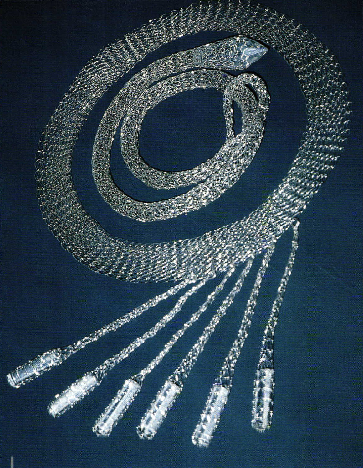 Some of them, like Blanka Sperkova, just use the techniques of textile production processes, especially of classical knitting. But her material is metal wire. She is producing three-dimensional objects, jewelry covering a broad variety. She unfold and expresses her specific creative imaginations with extraordinary sensitiveness to the properties. Quite a lot of designers prefer decorative elements in connection with abstract ones and critical expressions, like Vladimir Komnacky.