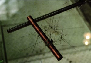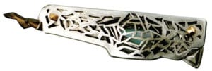 Another representative of constructivism is Pavel Opocensky, born in Karlovy Vary in 1954, having worked and resided in the United States in the eighties and now returned to his mother country. He has always been fascinated by technological elements, but he designed the pieces into sculptural appearances and combined them with functionalism. In his contemporary works he is carving away material or layers of material, thus approaching the basic structures. He sticks to geometrical abstraction and minimalism. In his collections of pins we can find compositions produced by the penetration of light through two different elements.