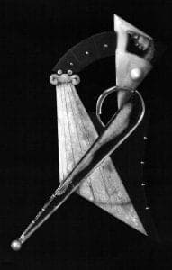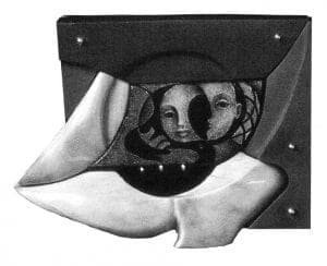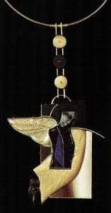 Those images are haunting: a crouching figure under a layer of crackled glass held together in an embrace outlined in silver wire (Inner Child), a double portrait that becomes a triple when a profile is discerned between the two faces (Family Portrait), a diva performing in a shower. These small enamels framed by abstract shapes go beyond being a beautiful thing to wear. They offer a rich visual experience, but the restraint the Imres exercise in limiting their color to gray scale and the straightforward geometric forms of the soft slate and smooth ivory of the mountings keep these pieces in a cerebral realm. This is also a place of deep feeling and intellectual engagement where they tell their personal stories. Daniela explains that all of their work reflects her mood when they are made, but the directness of form and image allows those who see the works to interpret the stories for themselves.
