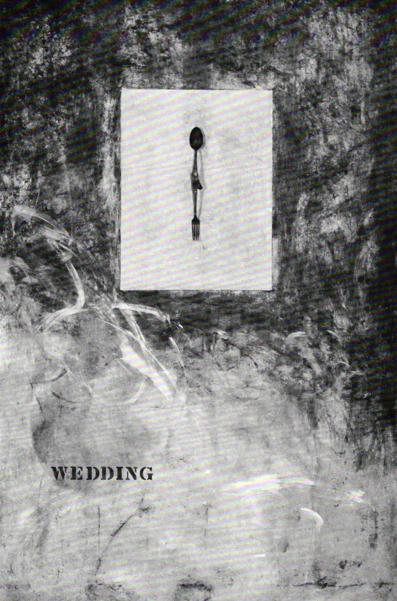 Wedding very successfully capitalizes on a reciprocal relationship between the visual and verbal. The word "wedding" floats on the surface of the piece like an invented shape that is but one part of the sensitive balance of ling shape and color. In contrast, the utensils become almost hieroglyphic codes, coyly and mysteriously waiting to be deciphered. Each aspect, however, also retains is integrity and meaning as a word or as an object. Choosing which text to read is the joy of discovering this profoundly beautiful and intelligent piece.