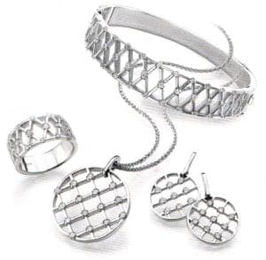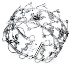 Jewelry All white metals: Platinum, white gold, silver; black and white stones: sparkling diamonds, mountain crystal, smoked quartz and onyx in combination with dispersed pink nuances of sapphire and tourmaline; white South Sea and black Tahiti pearls; silvery-shiny jewelry.
